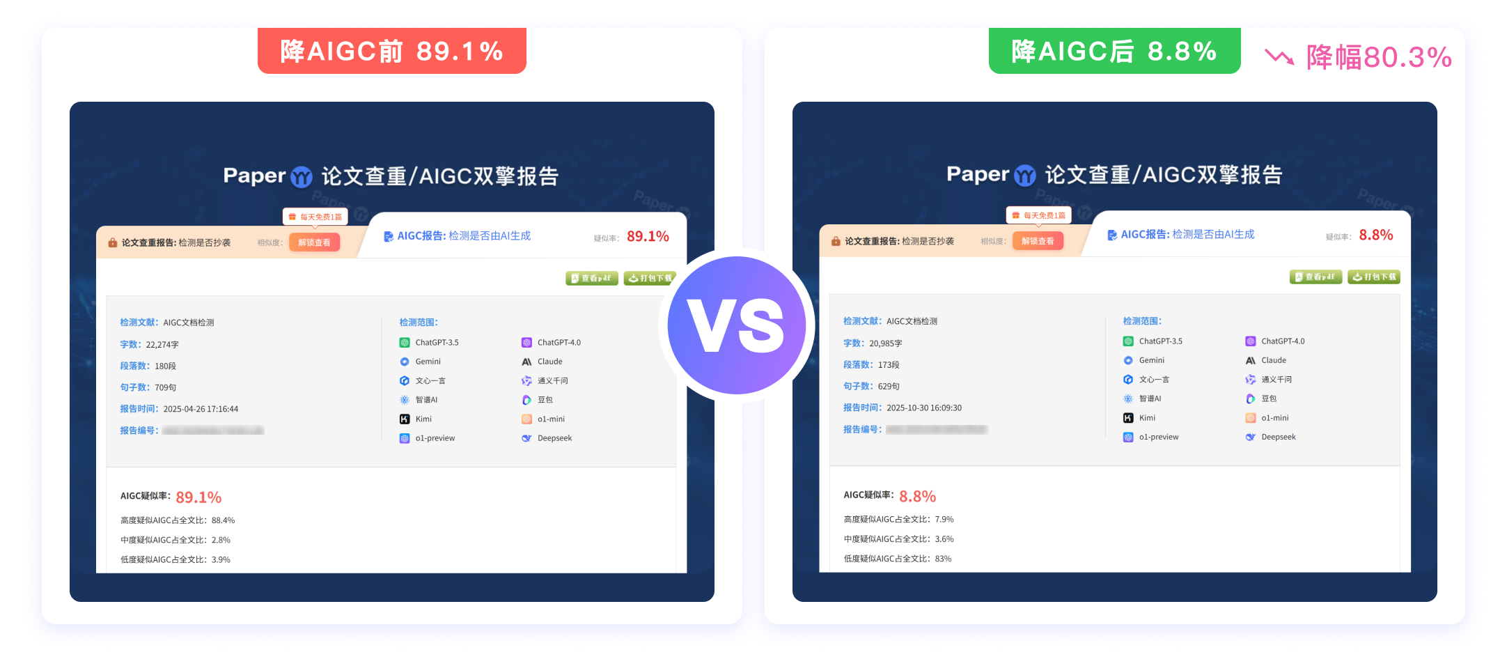 2025年,随着知网、维普等主流平台全面升级AIGC检测算法,仅靠同义词替换和语序调整的“传统手艺”已然失效。检测系统通过分析文本的“困惑度”和“突发性”,能精准捕捉AI生成文本逻辑过于平滑、句式机械重复的特征。 面对动辄超过50%、甚至90%的AIGC检测率,许多用户陷入了两难:既需要大幅降低“AI痕迹”,又极度担心工具会破坏费尽心血完成的专业表述、核心数据以及复杂的论文格式。 而如“快降重”这类垂直专业工具,其价值在于提供了一个“一站式、高确定性”的解决方案。用户支付少量费用,购买的是显著的效果、节省的大量时间、免除的格式烦恼以及效果不达标的退款保障。